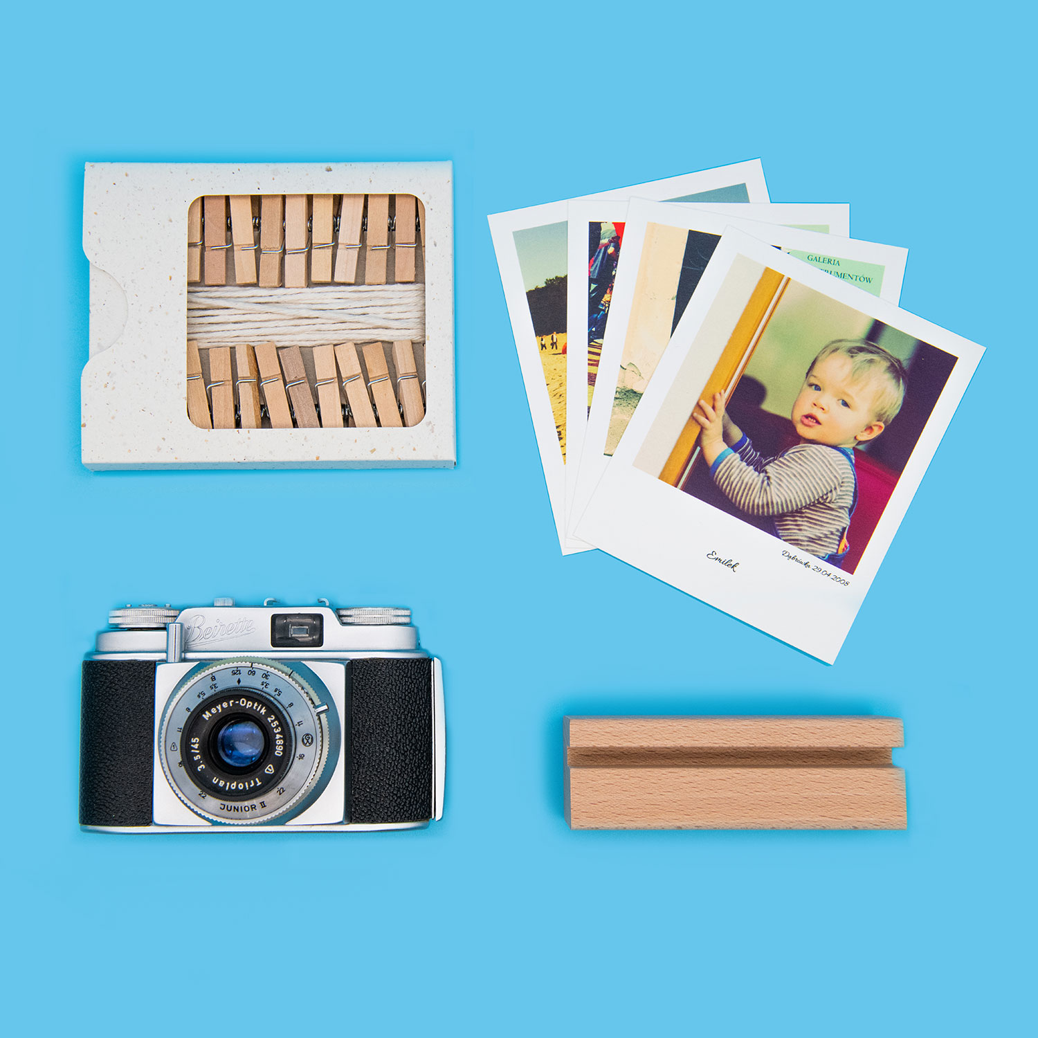 A teraz najważniejsze - wybierz idealną opcję dla siebie! Możesz wybrać podstawowy zestaw, który zawiera 25 sztuk odbitek 10x12 cm wraz z papierowym pudełeczkiem z okienkiem. A może bardziej złożony zestaw z dodatkami? To 25 sztuk odbitek 10x12 cm wraz z papierowym pudełeczkiem z okienkiem, dodatkowo otrzymasz piękną drewnianą podstawkę z bukowego drewna, 26 sztuk mini spinaczy ze sznurkiem, oraz opakowanie Eco Gift Box