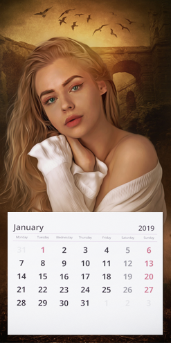 FOTOKALENDARZ PRO B2 to produkt skierowany do najbardziej wymagających klientów, drukowany jest na matowym, naturalnym papierze Arctic Matte 170 g/m2 na maszynach HP Indigo w formacie B2 (50x70 cm) w pionie i poziomie. Wykorzystanie systemu siedmiu barwników i śnieżnobiałego całkowicie matowego papieru skutkuje uzyskaniem szerszego gamutu kolorystycznego, otrzymujemy bardziej naturalne kolory, szczególnie skóry, uzyskujemy szczegóły w jasnych szarościach i głębokich cieniach. Kalendarz ma czternaście stron - kartę techniczną z kodem kreskowym (którą należy delikatnie wyrwać, m. in. zabezpiecza ona okładkę przed zarysowaniem w trakcie transportu), okładkę i 12 miesięcy. Wszystkie karty połączone są ze sobą za pomocą sprężyny z zawieszką. Ty decydujesz od którego miesiąca zaczyna się i na jakim kończy Twój kalendarz. Dzięki temu możesz zamawiać ten produkt bez względu na porę roku. Fotokalendarz PRO B2 oferuje możliwość personalizacji - dodania ważnych dla Ciebie dat: urodzin, rocznic itd.
